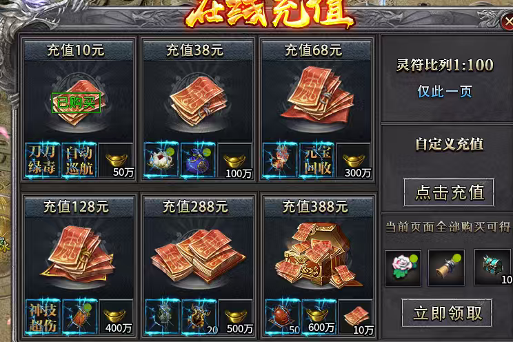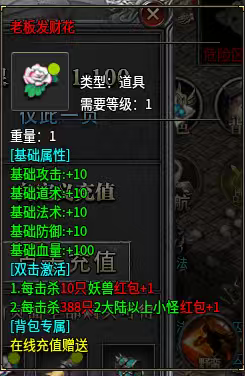 接着我们讲讲直充里面送的好玩意,都是特别实用,38元(灵符花每天获得6666绑定灵符,六转材料包)!68元(切割宠物4000切割,元宝回收多百分之五十)128元(神技增伤,斩妖令,后续会发图片)288元(乾坤圈首刀斩杀妖兽百分之十血量,还有20个宠物抽奖令)388元(50个仙缘洗练丹,前后期很重要物资)全部购买额外赠送五万灵符,10个神器箱子,背包神器老板发财花(后续会发图片)妖兽猎人称号(斩杀妖兽百分之15血量)