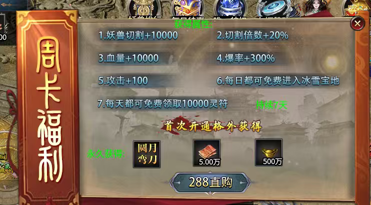 冰雪特权,这个是打金玩家和小资玩家首选,解绑材料加切割…而且只需累氪48元就可以领取